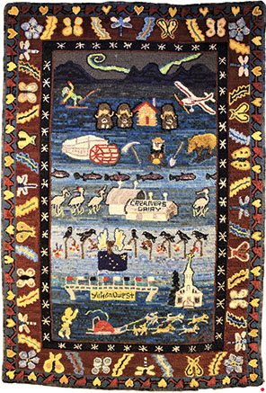 The centerpiece of your rug will be a figure doing something they love to do. Kate’s caricatures typically focus on Alaska sports and the outdoors, she calls this series “Girls Just Want To Have Fun.” Your caricature can focus on any activity – like: cooking, riding a motorcycle, flying an airplane, gardening, hiking, etc.