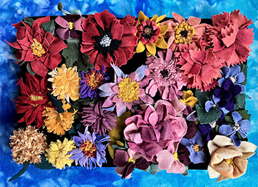 A wide variety of beautiful hand dyed wools will be available for purchase in class, as well as some “bargain bundles” of as-is textures, plaids and solids. The tools we will use are handmade Proddy “sticks” and “pokies”, which you can purchase, borrow, or bring your own. Fifteen different Proddy Blossom kits will be available, blank linen in various sizes, as well as packets of novelty yarns and trims suitable for embellishment. If we need to engineer another type of flower form, we can problem-solve together on the spot! Everything will be demonstrated with historic commentary, and each student will leave with handouts and written instructions.