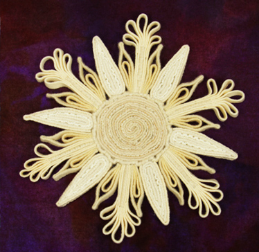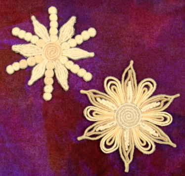 Quilling with wool is a technique using strips of wool which are rolled and coiled, then stitched or glued. Free form quilling expands this technique to include ovals, squares, arches, teardrops, waves and squiggles of wool, in addition to circles. This workshop will focus on the free form quilling shapes which lend themselves to snowflake motifs. Free form quilling may utilize ever changing patterns or be used to create specific, repeating designs, such as this snowflake. It may also be incorporated into hooking and other mixed media projects. Free form quilling is a great way to use wool blankets, coats, clothing or over felted wool that is too thick for hooking. In addition to the snowflake samples, Annette will bring other finished pieces which showcase the amazing versatility of this technique, to serve as examples and inspiration.