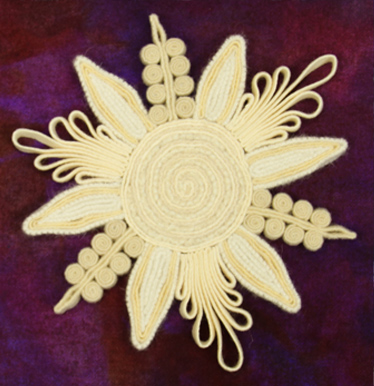 In this workshop, Annette will guide students in designing and creating their own free form, double sided snowflake mat, approximately 10” in diameter, using felted, precut ½” wide strips. Or students may choose to create 3 smaller, mug rug sized mats 5” in diameter instead. She will bring a large assortment of precut, ½” wide, white, natural and textured wool strips for you to choose from to create your unique mat. Using one, two, or multiple strips at the same time, students will learn how to stitch and glue a variety of quilling shapes, which will used in designing their own snowflake(s). Other topics covered will include creating, then joining quilled components together and how to add quilling to a rug hooked piece.